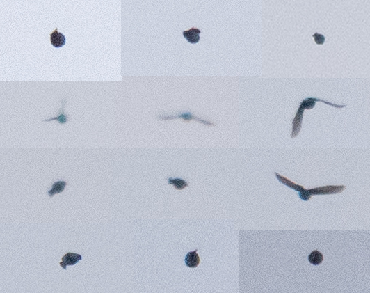 Beskrivelse: Udklip fra nogle af de sløje fotos, jeg fik af fuglen d. 9. maj 2024, efter der blev råbt "Blå fugl!". Den lettede tilsyneladende fra et krat, hvor nogen havde hørt et mærkeligt kald i en periode op til.