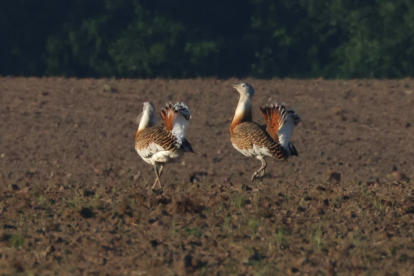 Beskrivelse: Så lykkedes det endelig at komme på rimelig fotoafstand til stortrapperne. De viste deres parringsdans i den spæde morgensol.