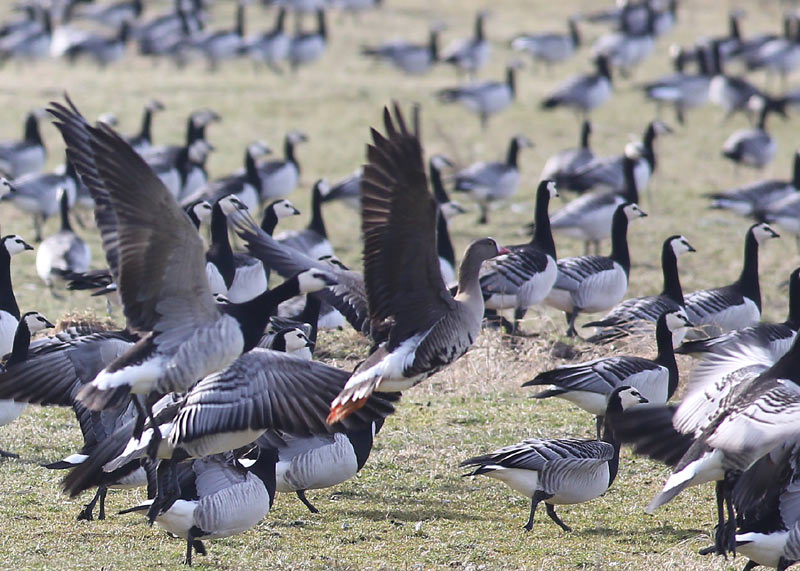 Beskrivelse: Fuglen holder til i de store flokke af Bramgæs, der huserer omkring sydvestpynten. vi fandt den hurtigt bag Kongelundshallen, hvor fuglen fouragerede tæt på. En Vandrefalk fik flokke til at forflytte sig til Sydvestpynten (det er hvad der sker her...), hvorfra de lettede 1055 og siden gik dværggåsen ned med en mindre flok Bramgæs på strandengene udfor Kongelunden.