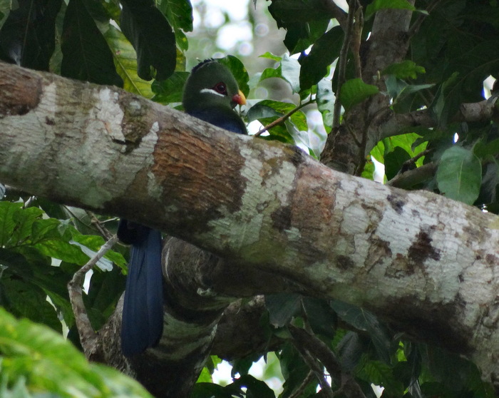 Beskrivelse: Almindelig i regnskoven i Ghana, i det mindste at dømme ud fra antallet af kaldende fugle, men noget sværere at få set en grøn fugl oppe i trækronerne, på trods af størrelsen.