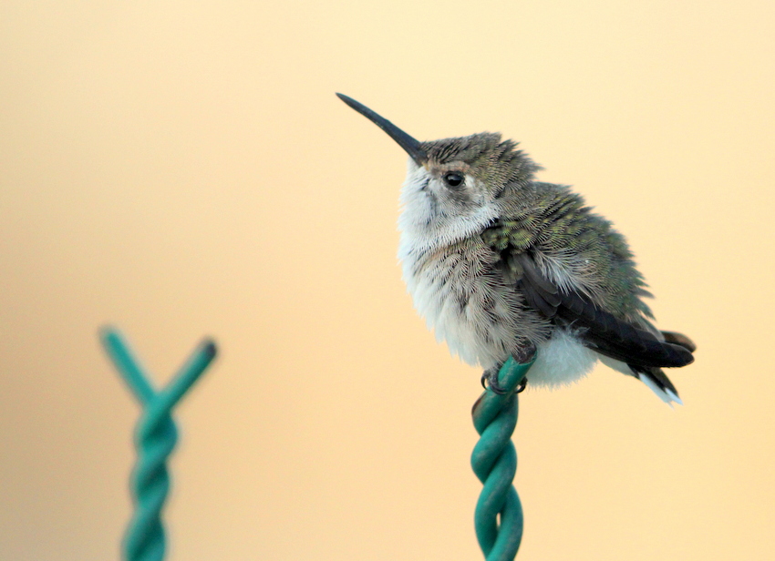 Beskrivelse: Endemic to 2-3 states of Mexico - not common but most common in scrub and mangrove (and smaller cities near by)in the far costal north of Yucatan and Quintana Roo. Here at 6 am in the morning at the ordinary size chicken-fence in front of a village-house - an app. 3 month old juvenile; - fully able to fly and 'escape'. By the way - the tail of the youngster shows the beginning 'shear-tail'. Another picture shows that the young bird was waiting to be 'serviced' by a parent bird. I presume that the young bird might be a female - white tail-tip - and plain white chin and breast. In 3 days 5 individuals was seen: 1 male and 4 females/one juvenile. All in village Rio Lagartos and Las Coloradas. As can be anticipated it is a SMALL bird :-) ... same individual as the other up-load (if accepted).