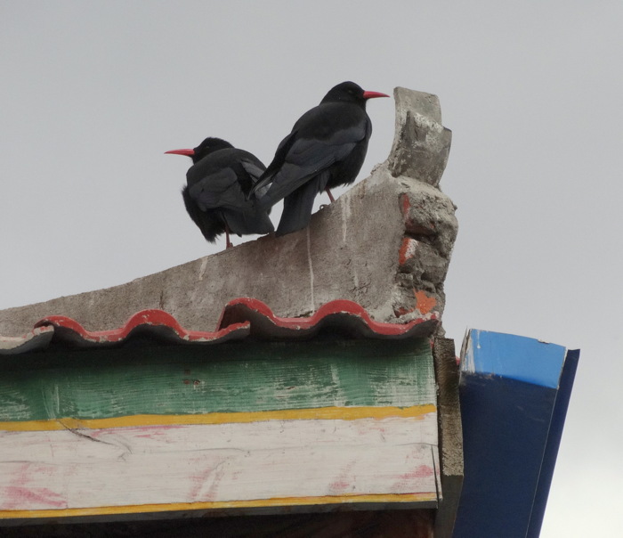 Beskrivelse: En gruppe alpekrager holdt til omkring templet og torvet i byen, som alliker herhjemme.