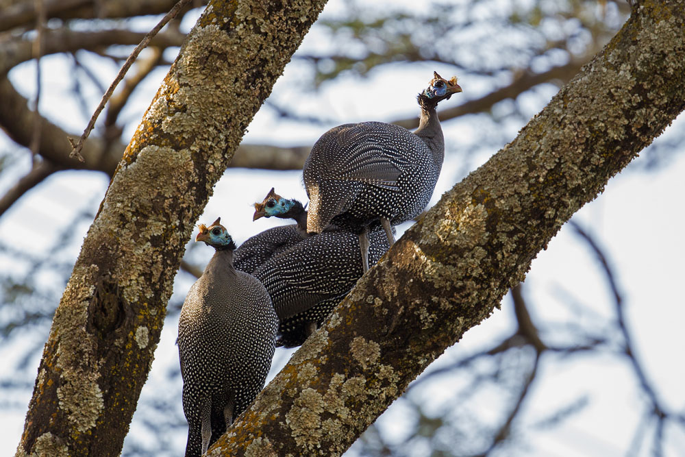 Beskrivelse: Perlehøns er gerne meget sky og løber væk på stor afstand, når de færdes på jorden. Men når de har søgt tilflugt i et træ kan man komme meget tæt på dem! Billedet er taget på østsiden af Rift Valley hvor racen somaliensis burde forekomme, men fuglene er altså af racen meleagris. This should be ssp Meleagris (rounded blue gape wattles) and not ssp somaliensis (which has pointed red-tipped gape wattles)