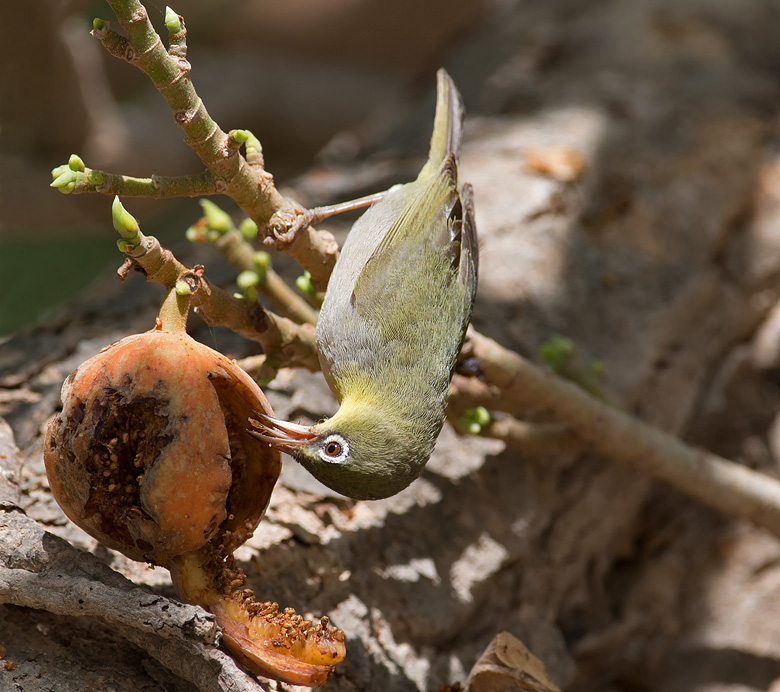 Beskrivelse: Også kaldet White-breasted White-Eye. Fouragerede 26.3 og helst i skyggen på i forvejen åbnede, modne figner - fik frugtkødet med de små kerner ud bl.a. via en lidt lang tunge.