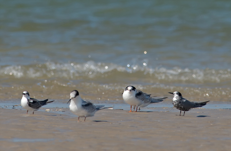 Beskrivelse: Rastende på stranden mellem Fjordterner. (1 cy ungfuglen lidt mindre og med mørk halsplamage )