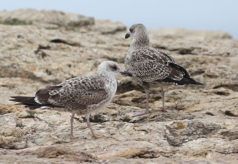 De har typisk grovspættet underside og større andel af lyst på dækfjerene end <i>michahellis</i>. Om efteråret er ungfuglenes fældning længere tilbage, og fuglen t.h. har kun udskiftet nogle få ryg- og skulderfjer. Den er her mere i linie med Sølvmåge.