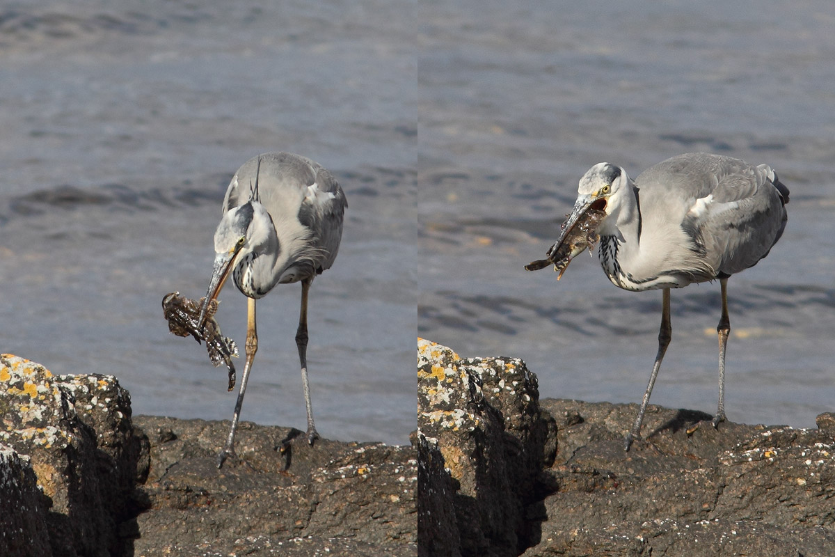 Beskrivelse: Hejren kæmpede i lang tid med ulken, men ned ville krabaten ikke. Om det lykkedes ved jeg ikke, da hejren på et tidspunkt lettede med fisken og forsvandt omkring den pynt, hvor jeg stod.