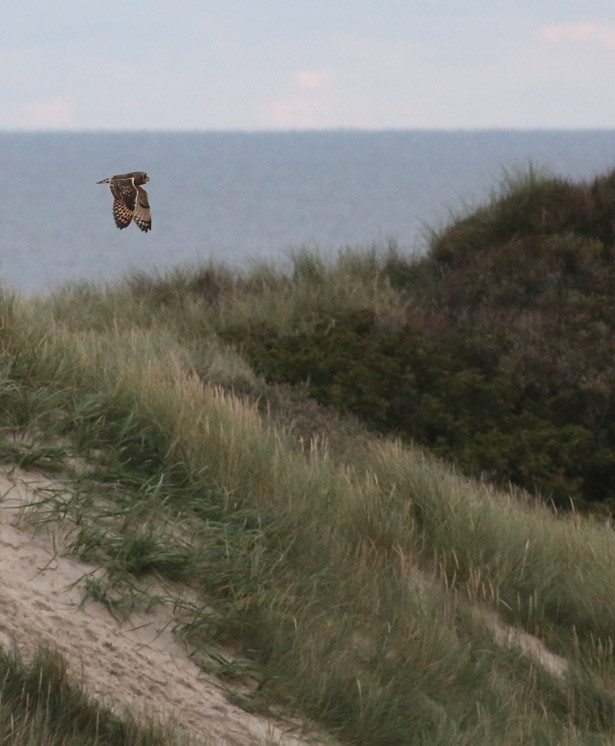 Beskrivelse: Indtrækkende mosehornugle fra morgenobsen på Felttræffets søndag. Én af to indtrækkende - og så kom steppehøgen!