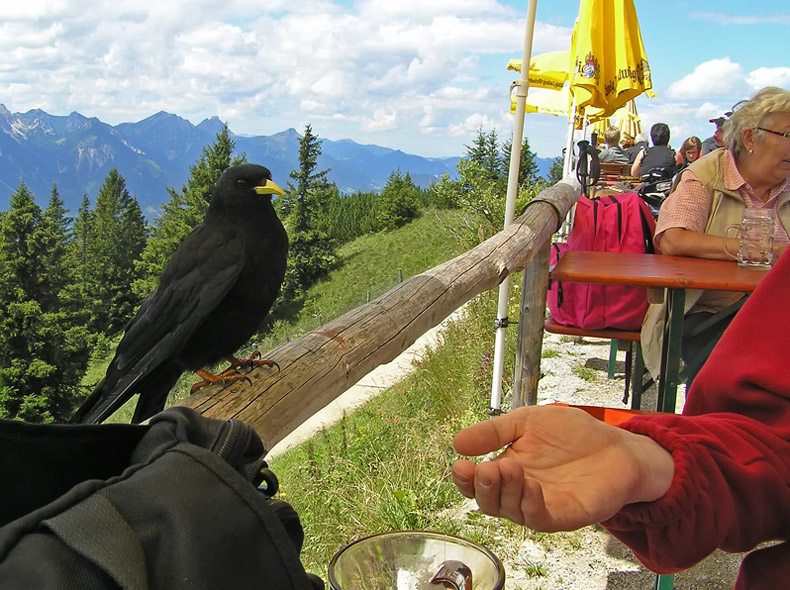 Beskrivelse: På en bjerg-restaurant (Tegelberghaus) i1708 meters højde (nås med svævebane), mødte vi denne Alpeallike. Den var ganske tillidsfuld, og som man næsten kan gætte af billedet, så kunne fuglen, dog med lidt tålmodighed, håndfodres, ganske som vi kender det med vore hjemlige café-Gråspurve.