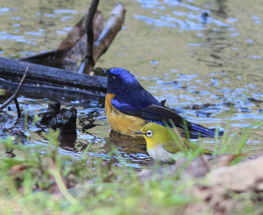 Beskrivelse: Oriental white-eye joining in the bath.