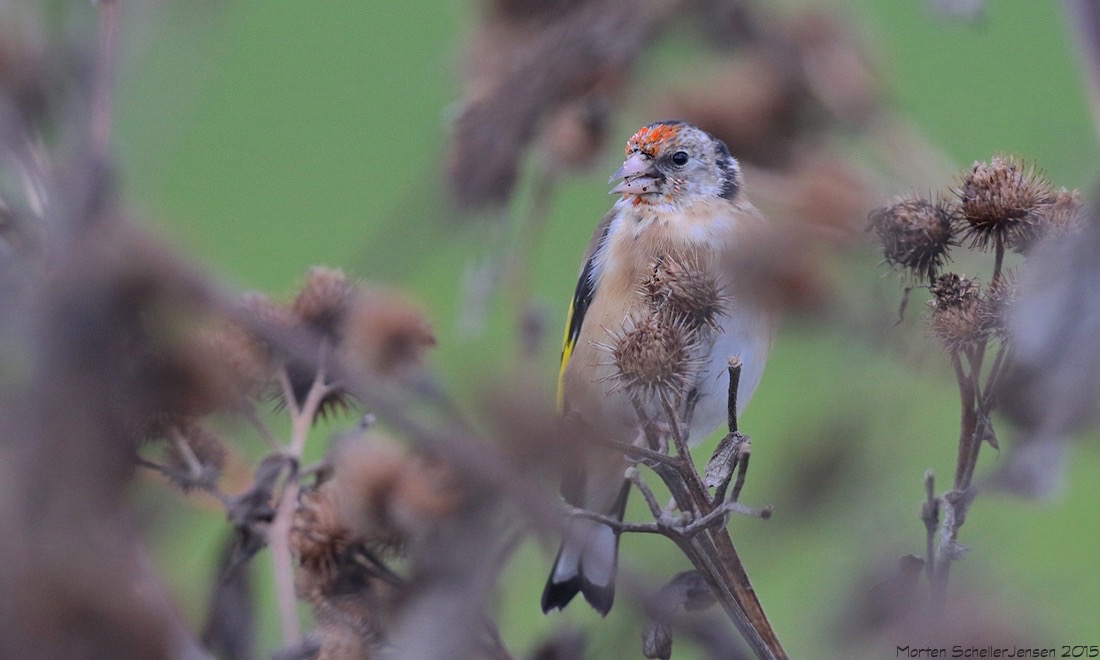 Beskrivelse: Med frembrydene røde fjer i hovedet