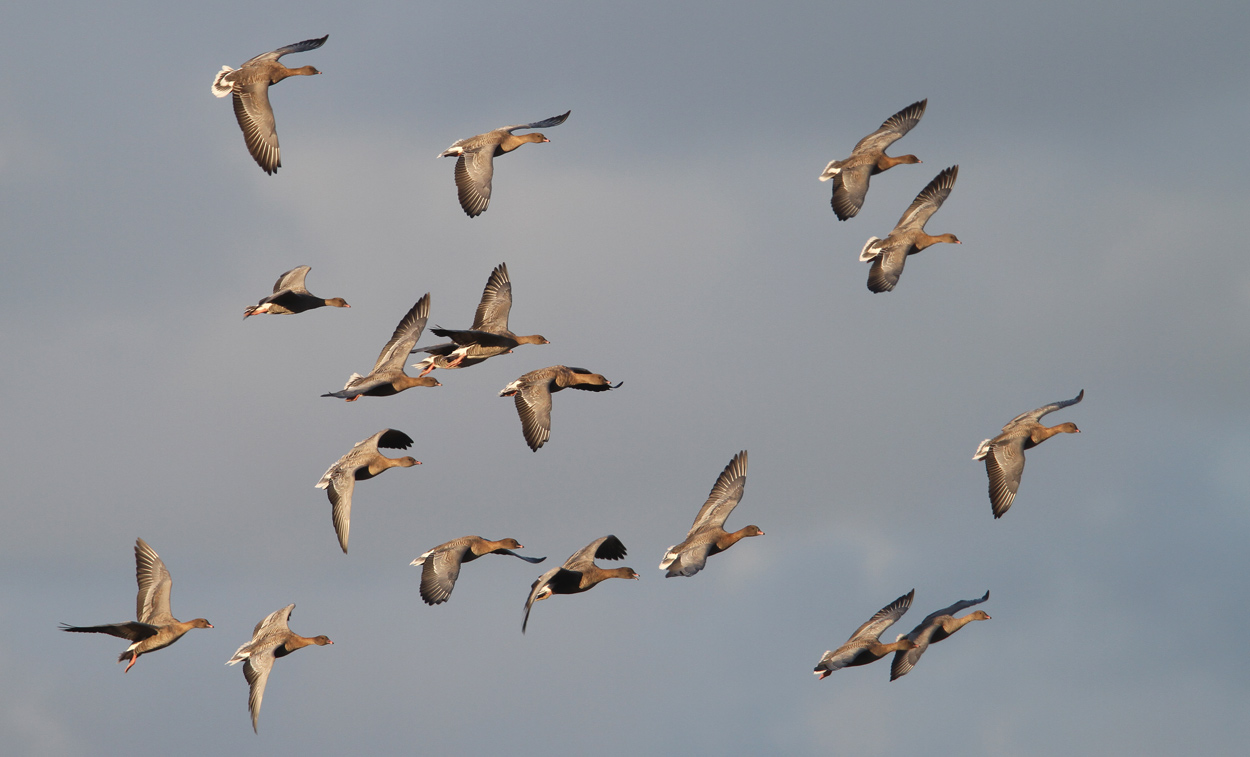 Beskrivelse: Var heldig, at nogle af de tilflyvende gæs fløj en runde inden de landede, hvorved det var muligt at få foto af oversiden i flugt.