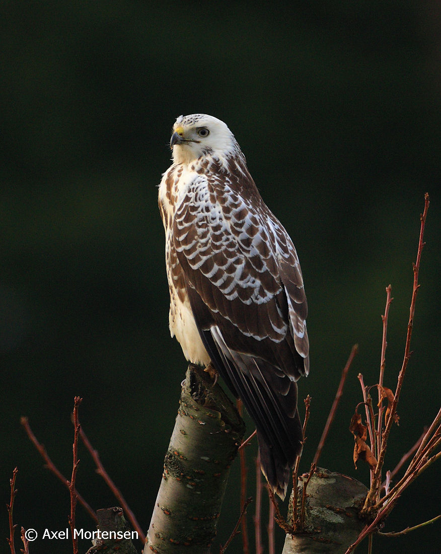 Beskrivelse: Denne lyse musvåge forsvandt fra området efter stormen, men var i dag kommet tilbage til den samme bondegård, hvor jeg sidst så den.