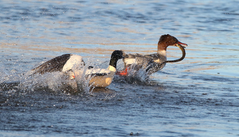 Beskrivelse: I den lave eftermiddagssol udspilledes der sig voldsomme kampscener i havnebassinet ved slusen. Denne hun med ål blev jaget af en han, som vandt kampen og dermed byttet.