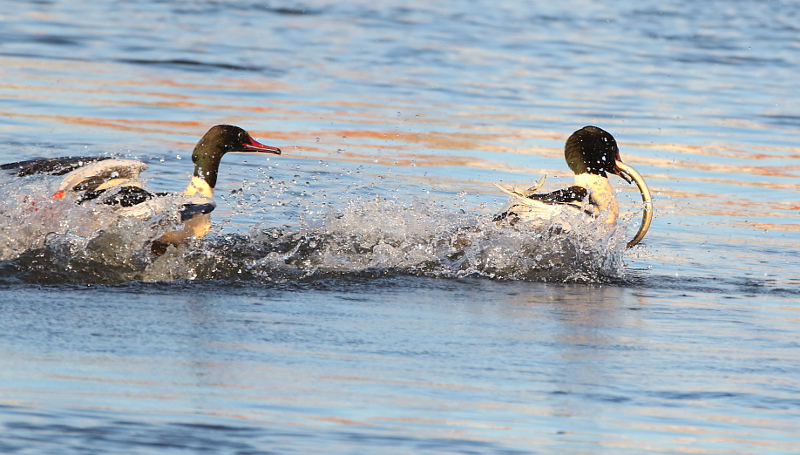 Beskrivelse: I den lave eftermiddagssol udspilledes der sig voldsomme kampscener i havnebassinet ved slusen. Denne han med ål havde stjålet ålen fra en hun, hvorefter han selv blev jaget.
