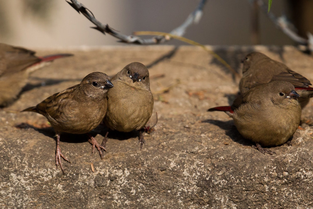Beskrivelse: Gennem en måneds tid havde jeg i min have i Addis Ababa, fornøjelsen af denne lille familie bestående af 2 adulte og 4 juv Red-billed Firefinch, samt en Village Indigobird (denne art har en gøgeagtig adfærd hvor den lægger æg i reder af Red-billed Firefinch). Ungerne sås fra de fløj af reden ult januar til ult februar (hvor de stadig var i området, men jeg rejste til DK) Den enlige juvenile Village Indigobird opførte sig fuldstændig som sine "søskende". Village Indigobird er fuglen i forgrunden til venstre.
