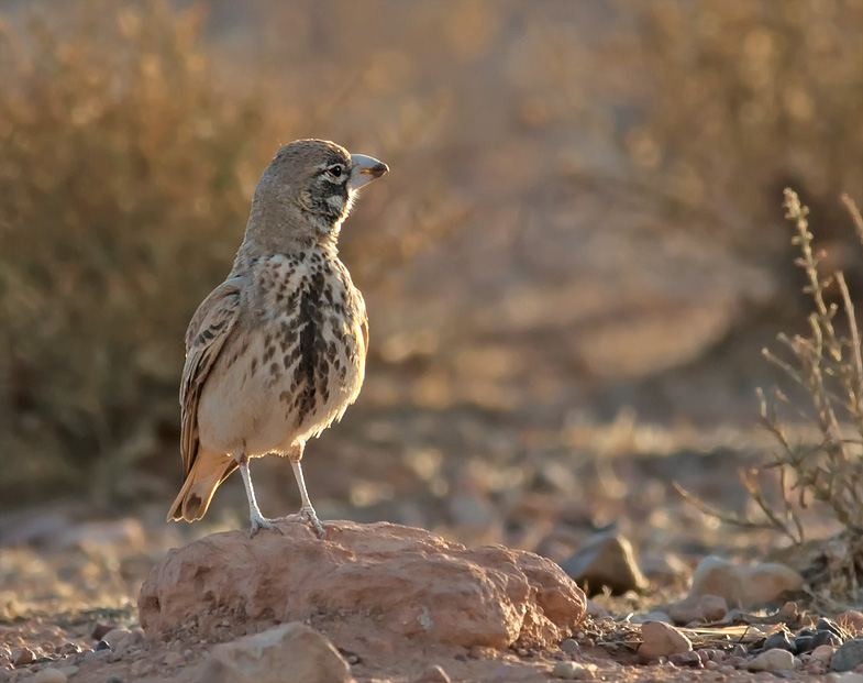 Beskrivelse: Den mørke næbspids skyldes formentligt i dette tilfælde mudder, men enkelte, andre Tyknæbbede Lærker næste dag viste uforurenet lidt mørkt på næbspidsen på dette tidspunkt. Denne fugl fra om aftenen på Dumpsite Tagdilt Track, hvor langt de fleste fugle findes om morgenen - på det fra vejen nærmeste, allermest ulækre sted , dér hvor de brænder affald af, hvor ca 30 (fredelige) hunde holder til, og hvor flest poser og affaldsdynger findes. Næste dag fandtes en flok på 5 Tyknæbbede Lærker på højplateauet længere inde ad Tagdilt Track, på de for arten angivne områder i Dave Gosneys ” Finding Birds in Morocco”.