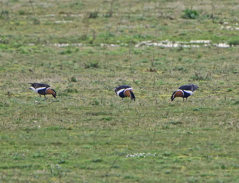 Selvom det ikke fremgår af billedet, var de rødhalsede gæs – ikke overraskende - en del af et større selskab, idét de var i følge med en flok bramgæs. (mellem 1000 og 1500 tidligere registreret i området den dag) Den nu langt mindre flok var på dette tidspunkt nærmest delt i 2, udenfor billedet var nogle til højre, andre til venstre for de tre, kun ca. 10-12 bramgæs i umiddelbar nærhed af de rødhalsede. Det mærkelige var, at de ikke, som normalt, havde slået sig ned bagest i flokken af bramgæs, men tværtimod fouragerede sammen med de nærmeste gæs ud mod fotografen, og var således usædvanlig lette at ”komme til”. En teori på dette kunne være, at I modsætning til, når der kun optræder én rødhalset i bramgåseflokken, er de muligvis en smule modigere, når de kan skiftes til at holde udkig.