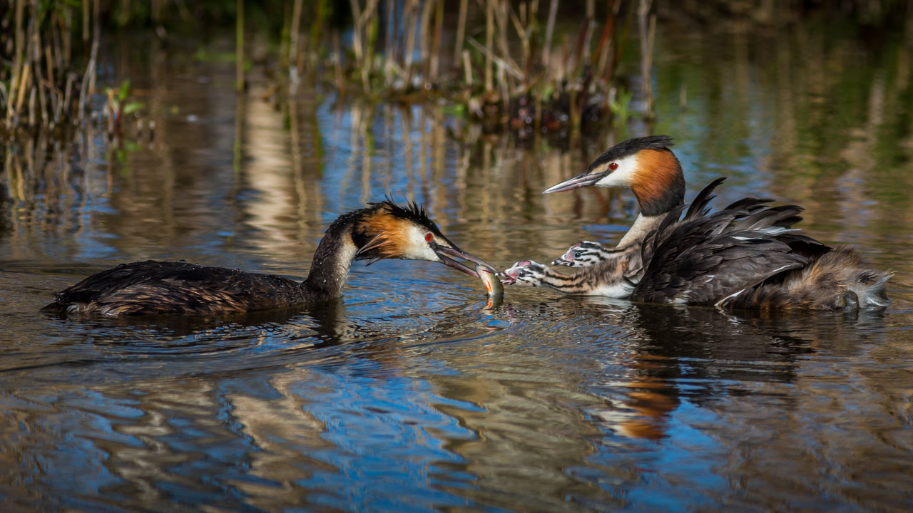 Beskrivelse: Årets første kuld Toppet Lappedykker ved Gentofte Sø får aborre. Der er fire unger på ryggen af fuglen til højre. Ungerne set første gang fire dage tidligere.
