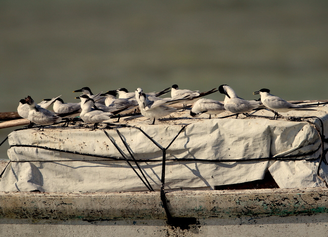 Beskrivelse: This picture is from a period where one can meet both winter and summer plumage in a group like this one. There is some debate on this taxon. A lot of guidebookes treats it as a ssp. connected to the European Sandwich Tern. Both 'avibase' and 'netfugl' calls it T. acuflavidus.
