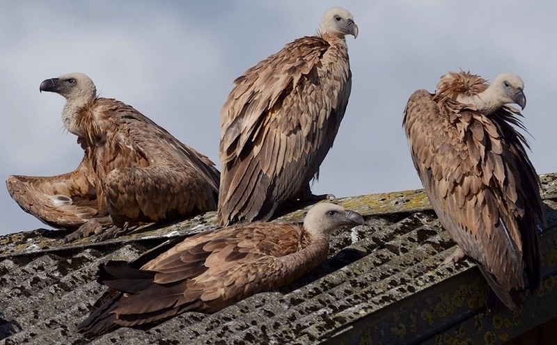 Beskrivelse: 18 Gåsegribbe ved en svinefarm ventende på et grisemåltid, men de fik ikke noget. Derfor fløj de fra stedet kl. 9.15, hvor jeg så dem tage højde og flyve hjemad.