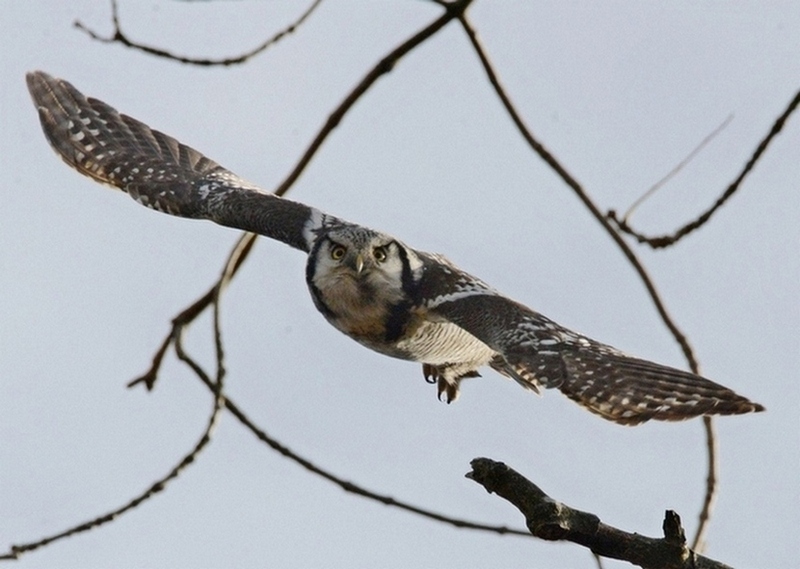 Titel: Høgeugle flyvende og landende