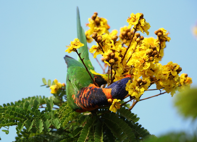 Beskrivelse: Common, acrobatic, noicy, fast and visible like is southern and eastern relative Rainbow Lorikeet.