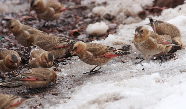 Beskrivelse: African Crimson-winged Finch. Skilt ud som selvstændig art fra den mellemøstlige Karmoisinfinke (<i>Rhopechys sanguinea</i>).