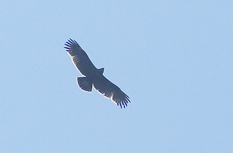 Beskrivelse: Stor Skrigeørn på trækforsg ved skagen. Fuglen havde meget mrk underside med sortbrunt hoved, underkrop og dækfjer samt en lille hvid "klammme" om knoen (basis af håndsvingfjer. I visse belysninger kunne erkende kontrast til lysere svingfjer, men dette er set mere udpræget. Oversiden mørkebrun med smalt lyst bånd på spidserne af store dækfjer; virkede ret slidt. Havde, som det ses - en del skader i ene vinge, men bred hvid vingebagkant uden forskelle i fjerenes generation signalerer 2K.