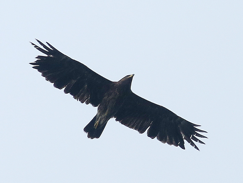 Beskrivelse: Meget mørk adult Steppeørn, der forvoldte en del diskussioner på stedet. Det store næb og den lange gule mundvig, der nåede øjets bagkant sås dog fint i lighed med typiske steppeørneproportioner med lange vinger hvor tydeligt knæk mellem arm og hånd sås og gav fuglen en vis lighed med en glidende fiskeørn rent proportionelt. Til forskel fra den mere bastante Stor Skrigeørn, der ogsåp var inde og vende. Steppeørnens normalt langfingrede indtryk var sværere da svingfjerene - som det ses - var voldsomt slidte.