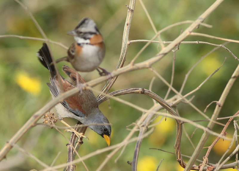 Beskrivelse: den endemiske Great Inca-finch ses her sammen med det modsatte: Rufous-collared Sparrow, der er udbredt stort set over hele Peru.....