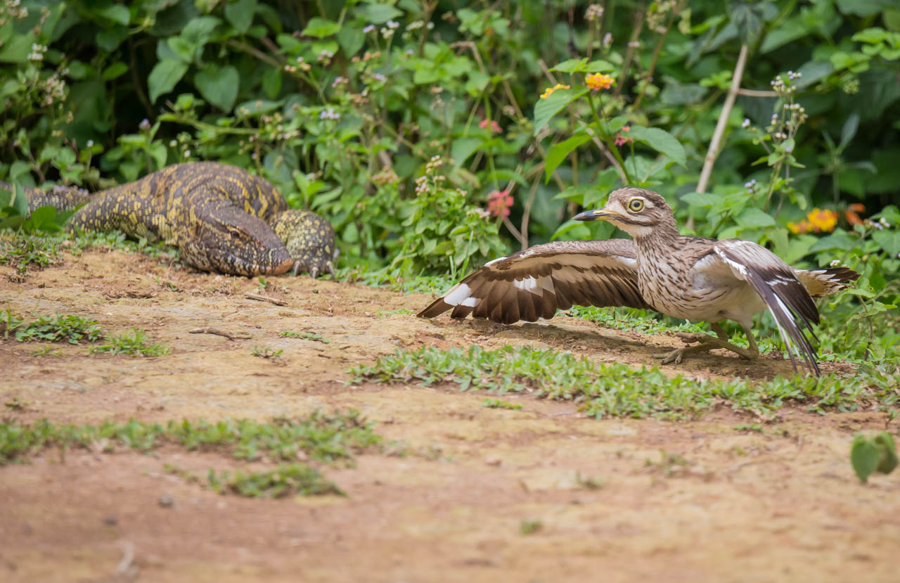 Beskrivelse: Vandtrielen forsøgte at aflede denne Nile monitors (Varanus niloticus) opmærksom hed fra sin mage, som lå på rede til venstre for billedet. Hakkede først på dens hale, og hoppede derefter ind foran og spillede syg.
