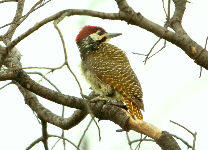 Beskrivelse: plain white throat, red (and dark) sub-moustachial stripe and full red crown visible. Indications for spots rather than streaks (as in Golden-tailed W.)