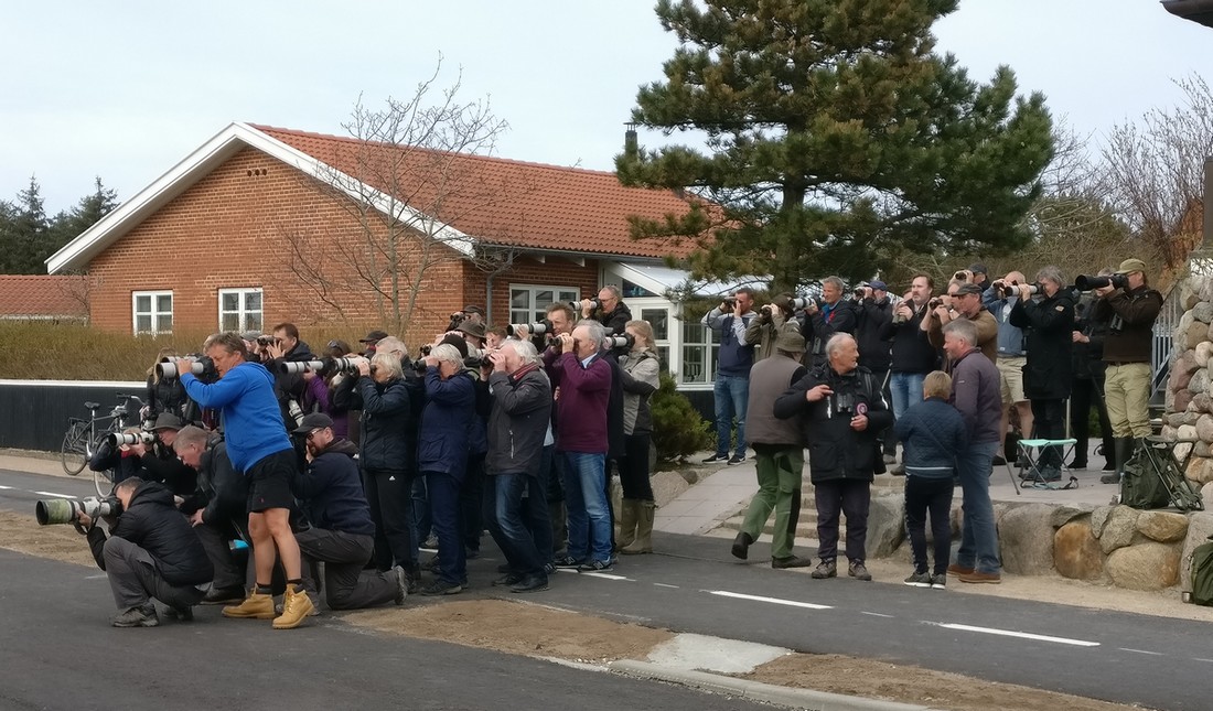 Beskrivelse: Klokken 16.16.25. Det er tid for de lange linser og den gulbrynede værling fotodokumenteres behørigt af horden af linsesvingere.