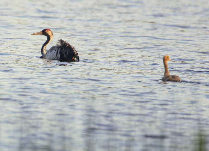 The young birds not able to fly (for the first 9-11 weeks) do swim a good deal if growing up i.e. at a lake shore to escape dangers or to feed. In that period the adult birds swim along with the juvenile birds. Beside this situation Cranes does not seem to swim. Here at 'our' lake the birds were seen swimming every evening on their way back to the nesting island in the little lake. Fist weeks two offspring, but this weekend - only one left.
