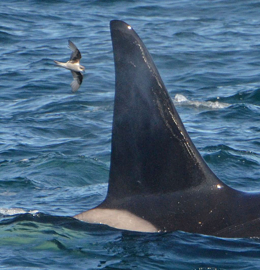Titel: Fork-tailed Storm Petrel Oceanodroma furcata furcata feeding near a pod of Killer Whales