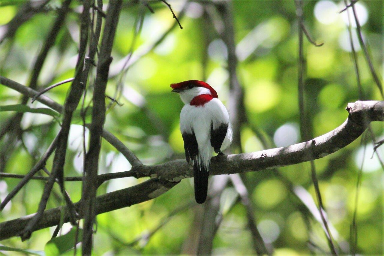 Beskrivelse: Araripe Manakin er en kritisk truet art, med en meget lille verdensbestand på nogle få hundrede fugle. Arten blev opdaget i 1996 ved et regnskovsområde med kilder, ved foden af en stejl klippevæg lidt uden for byen Crato i staten Ceara i Brasilien. Den er nu blevet byens logo. Hele bestanden yngler inden for nogle få kvadratkilometer. Den er nem at få at se. Man går ind ad en fin boardwalk i junglen, og flere hanner synger tæt på i øjenhøjde. Det var nærmest den første fugl vi så, da vi besøgte stedet.