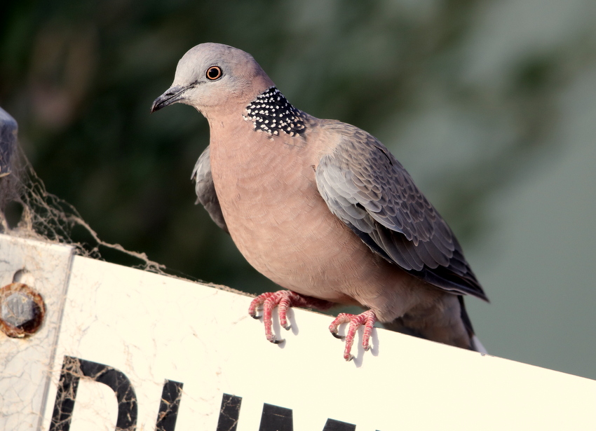 Beskrivelse: This dove is not native to Australia, but very common in SE and around Perth. It is ssp. tigrina due to distinctive black shafts of feathers on upperparts (and withe vent/under-tail)