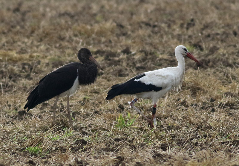 Beskrivelse: Ung Sort Stork i flok med 17 Hvide Stoeke, sidstnævnte fra det svenske storkeprojekt. Flokken trak ud fra Falsterbo 24.8, og holder de næste dage til på en mark i området ved Ollerup/Næsbyskov, hvor flokken skifter mark efter hvor det høstes. De følger ivrigt pløjningen, der kværner smådyr, der derefter fortæres af storkene. Fuglen er formentligt den samme, der i dagene omkring 20.8 holdt til på en mark ved tomelilla i Skåne, her i selskab med en enkelt Hvid Stork