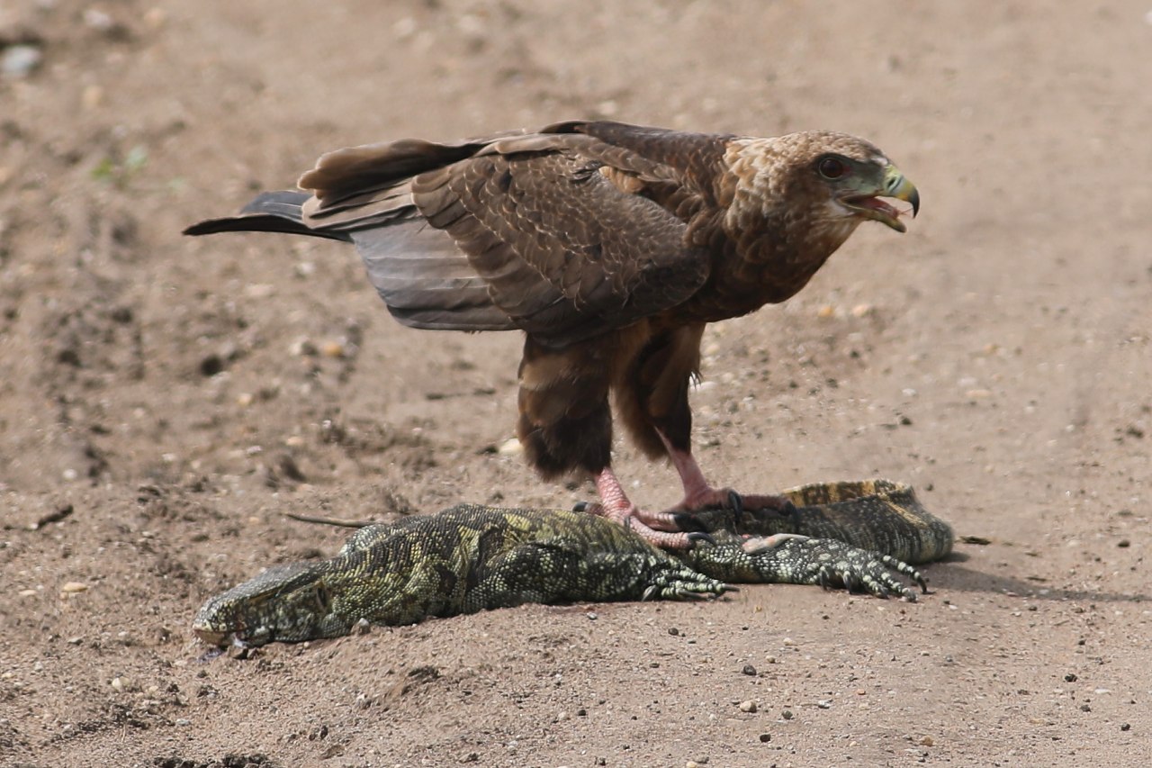 Titel: Bateleur (Terathopius ecaudatus) (Juv. with Nile Monitor)