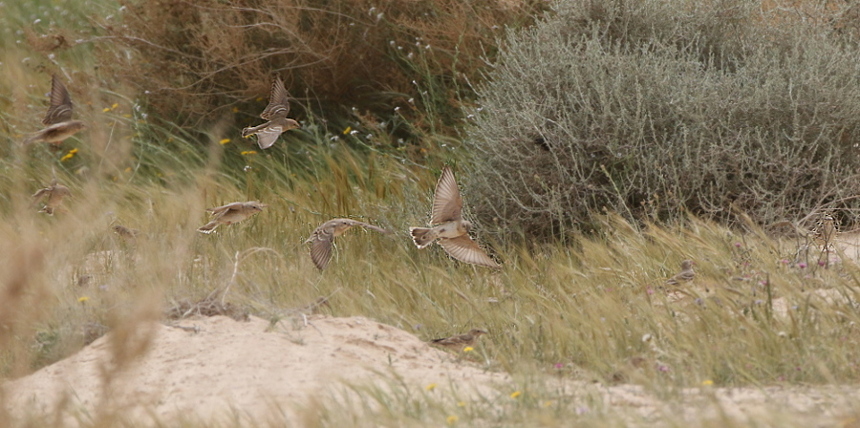 Beskrivelse: Klaus Malling Olsen guidede os til dette sted med lys stenspurv. Vi så en pæn stor flok, som ivrigt fouragerede. Flokken delte sig, og en mindre gruppe kom på fotoafstand.