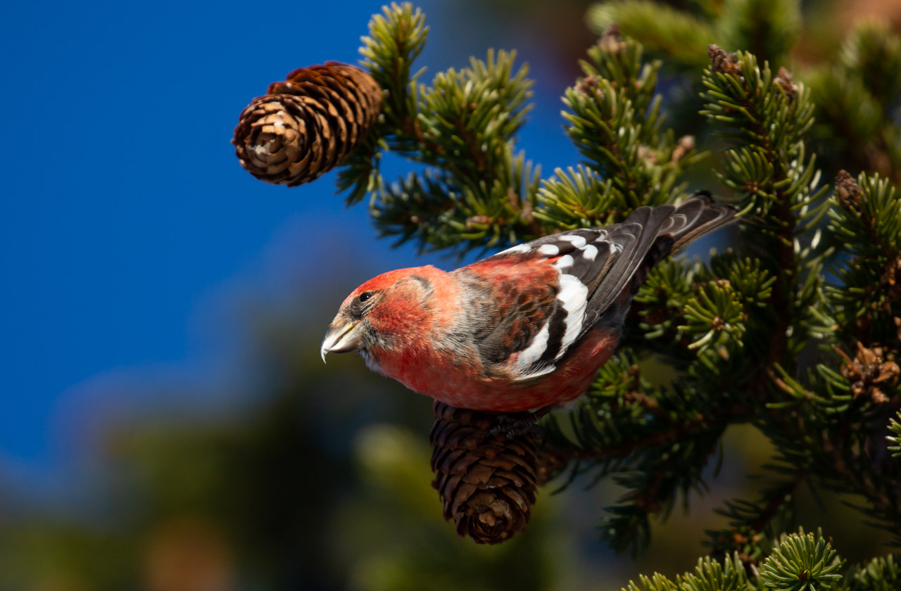 Beskrivelse: Hannen i et par hvidvingede korsnæb der fouragerede sammen.