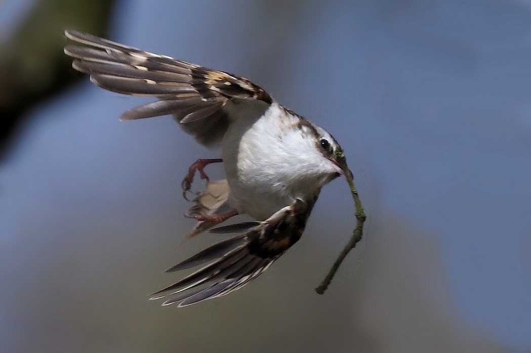 Beskrivelse: Materiale til reden, som træløberen er i gang med at bygge under en løs flage bark på en udgået eg.