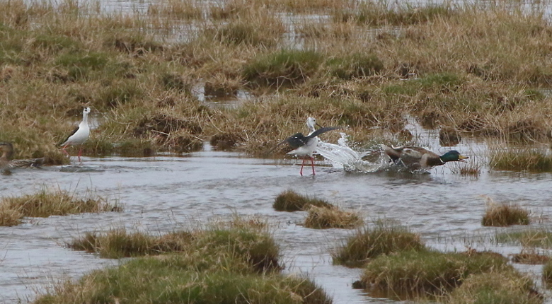 Beskrivelse: Begge stylteløbere ranker sig og løber truende mod to gråænder som hviler. Det lykkes at jeg først andrikken væk og derefter hunnen.
