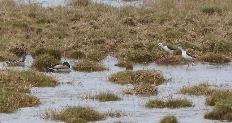 Beskrivelse: Begge stylteløbere ranker sig og løber truende mod to gråænder som hviler. Det lykkes at jeg først andrikken væk og derefter hunnen. Også stor kobbersneppe blev jaget på porten.