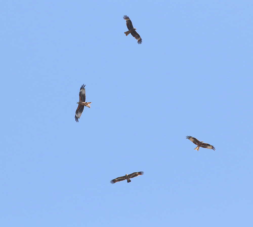 Beskrivelse: Steppeørnen skruede med røde glenter, en sort glente og hvepsevåger