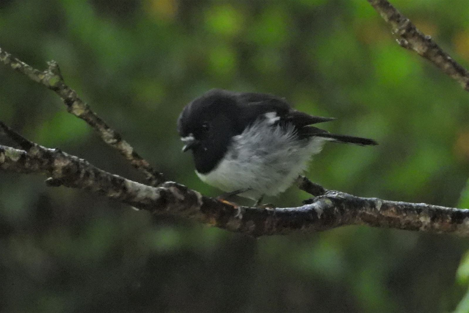 Beskrivelse: North Island Tomtit, male, en væver og svær fugl at fotografere. Bevæger sig meget i regnskovens buske og træer.