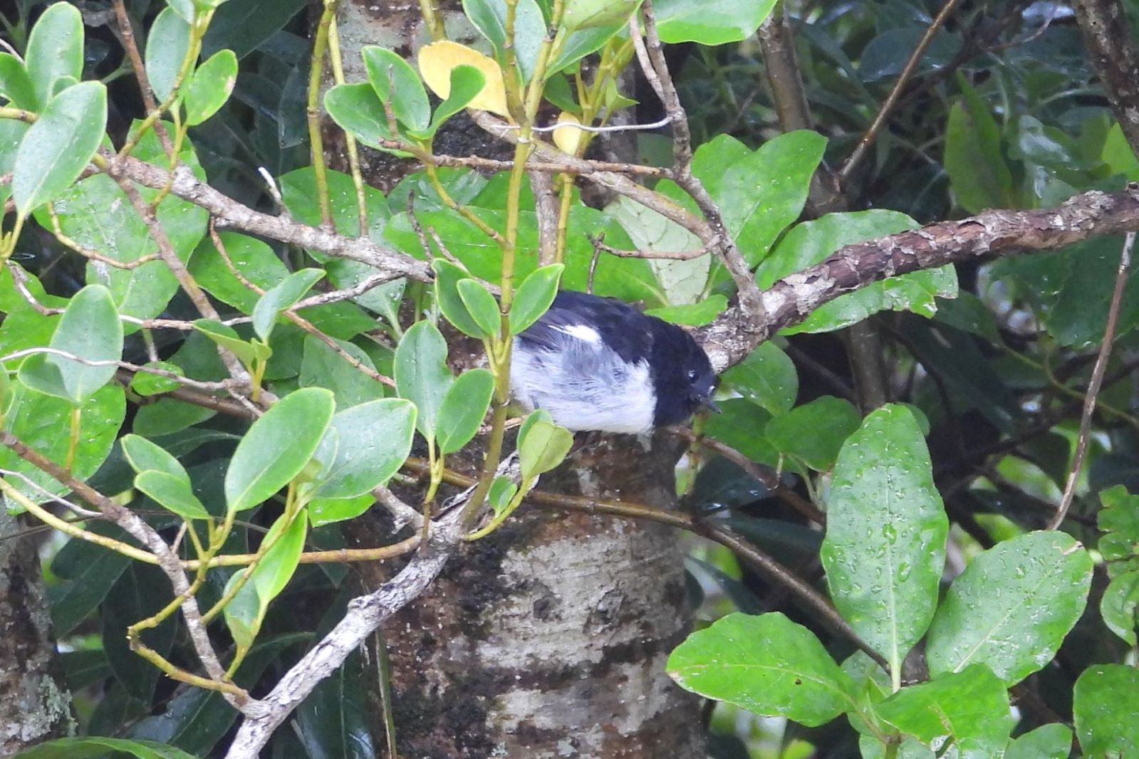 Beskrivelse: North Island Tomtit, male, en væver og svær fugl at fotografere. Bevæger sig meget i regnskovens buske og træer.