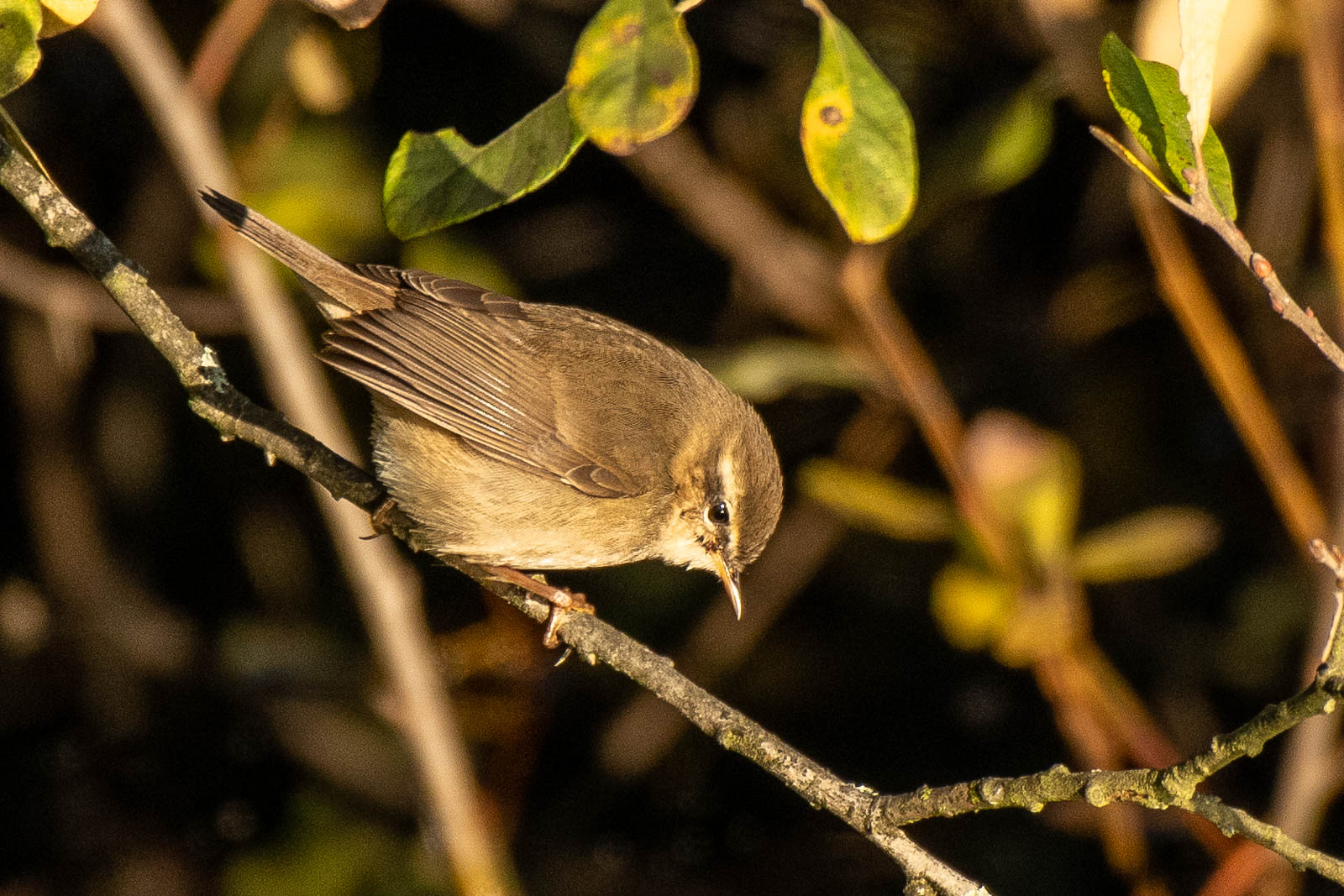 Beskrivelse: Brun Løvsanger fouragerer ved branddammen ved Blåvand Radiomast.