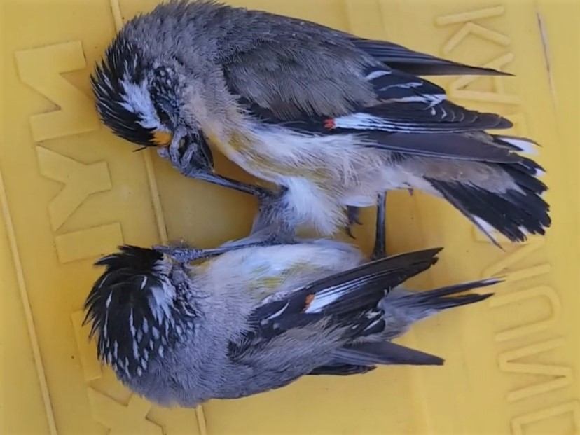 Beskrivelse: Docu-pic: My friend Gordon McHattie allowed me to up-load this strange happening: The two Pardalotes had a fall-out from the trees above the garbage bins .. ending up on the bins in in-fight for several minutes...
